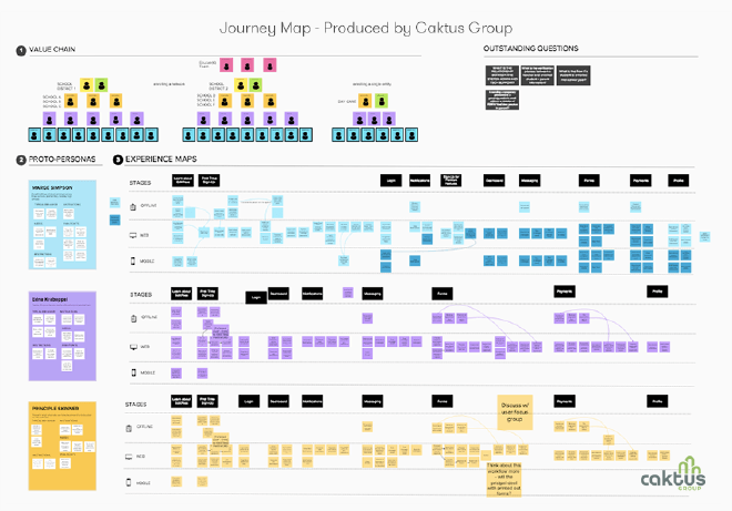 A discovery workshop allows all stakeholders to suspend the focus on building the product in order to think about creating experiences first. We use established and well-researched industry tools like journey maps (pictured above) to support our efforts.