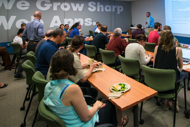 Why do we sacrifice our personal time to discuss the things we do all day at work? Simply put, it makes us better programmers. When I attend a meetup or talk, even on topics which only have a small overlap with the code I write on a day-to-day basis, I always learn something new. I don’t need to jot it down or record it; I wouldn’t ever think to go back and reference those notes anyway. But weeks, months, or sometimes even years later, when I come across a hurdle which requires a creative solution, something may nag me from the back of my mind. “Remember you once heard a talk about _?” it asks. “Maybe a solution like that one would help here?” To Google I go, with a topic in mind that gives me a jumping-off point.